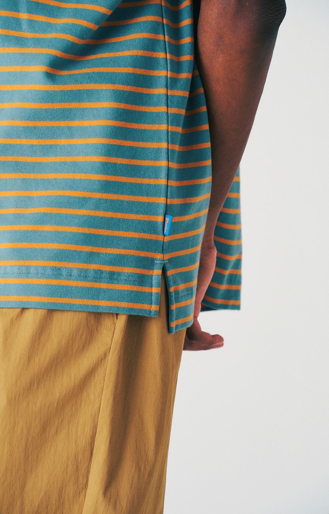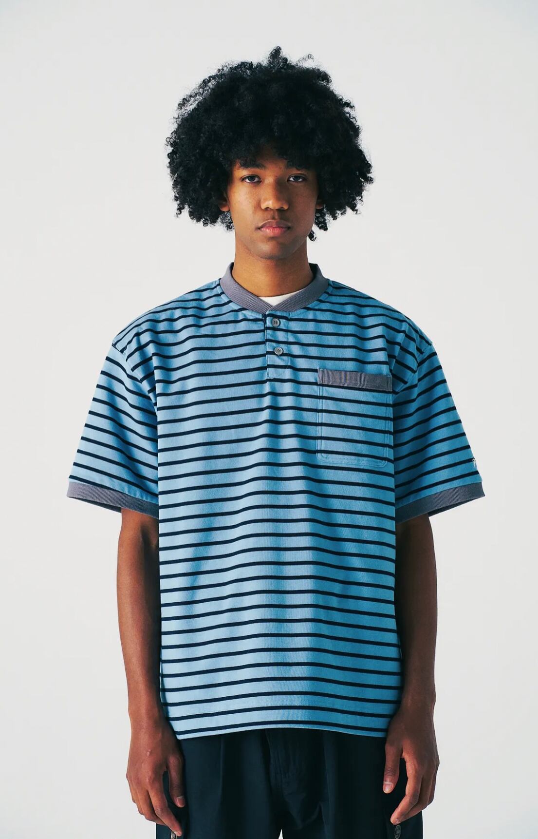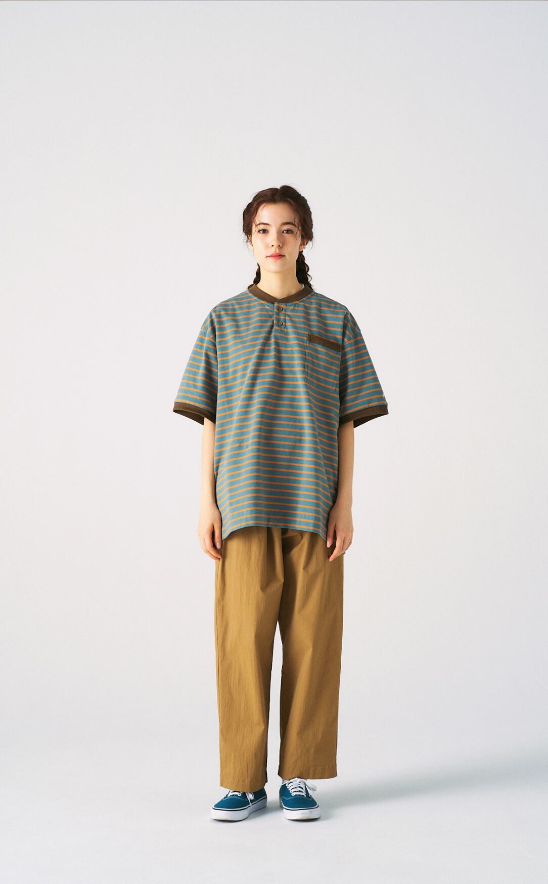 肌触りの良いコットンミニ裏毛素材を使用した、 ヘンリーネックボーダートリムTシャツ。